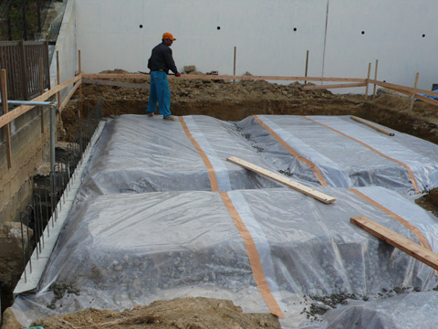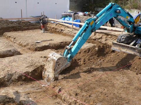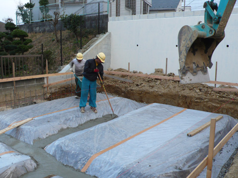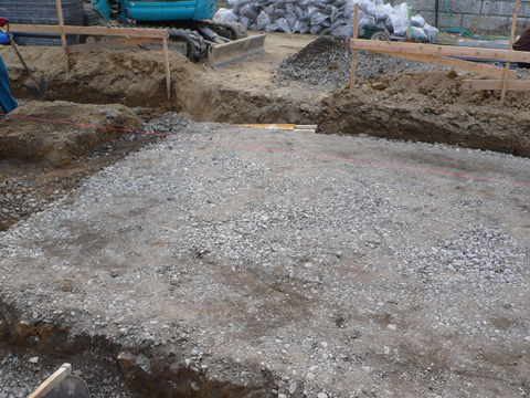 根切り工事から、砕石転圧、防湿フィルムシートを敷き、捨てコンクリートを打ちます。